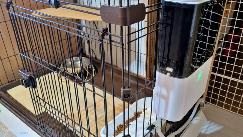 私の愛猫は普段は好きな所で寝たりしていますが、何かあった時にケージで過ごす場合のことを考えてドライのごはんはケージに自動給餌器を付けて与えています。