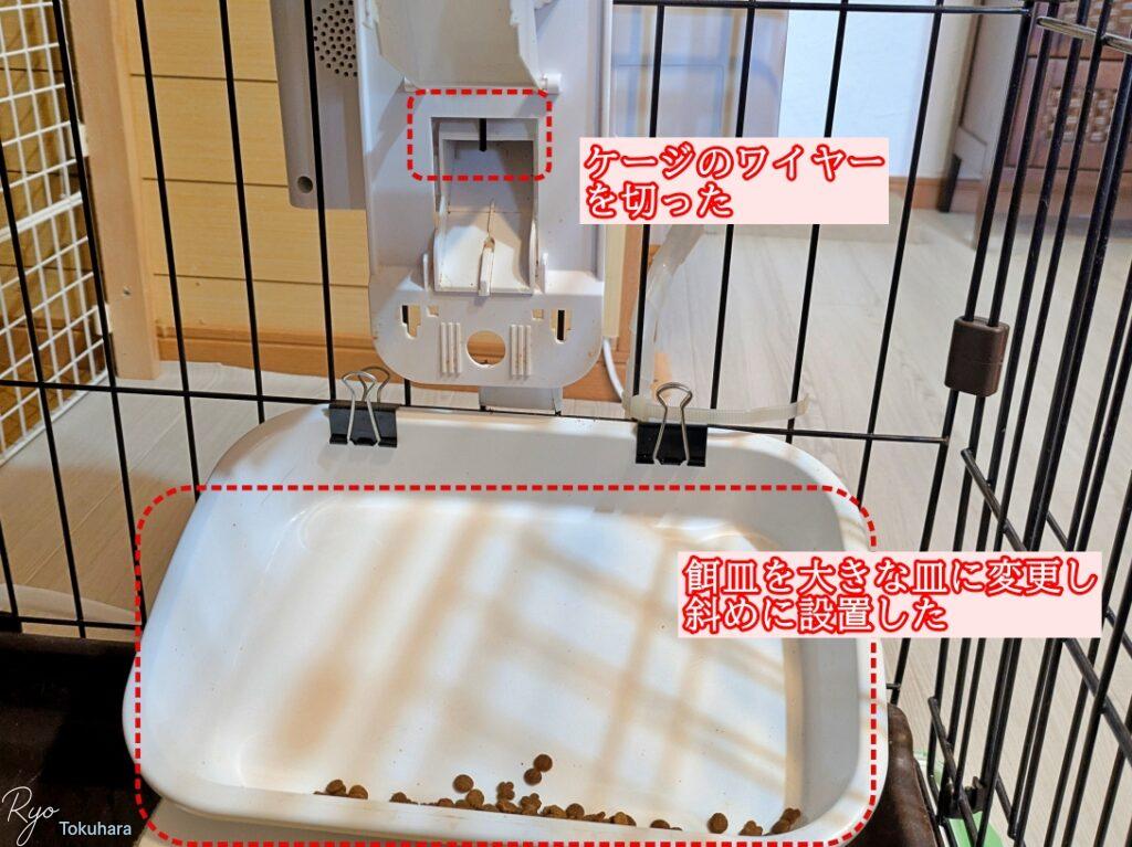 自動で餌が出てくる際に餌皿を飛び越えてしまったり、手前にまで落ちずに食べにくい状態がありました。大きな皿に変更し傾けて使用しています。