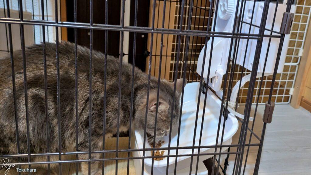 私の愛猫は普段は好きな所で寝たりしていますが、何かあった時にケージで過ごす場合のことを考えてドライのごはんはケージに自動給餌器を付けて与えています。