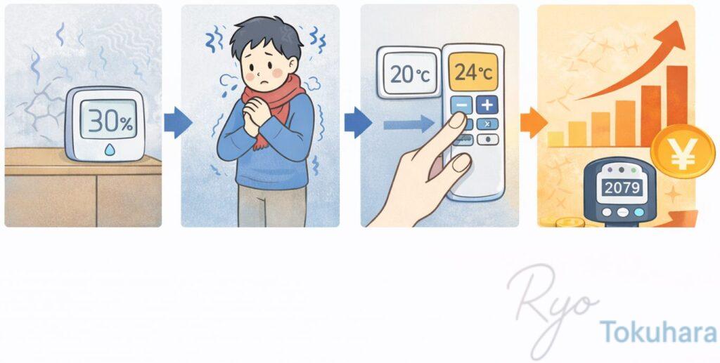 湿度が下がると体感温度も下がり、「まだ寒い → 設定温度を上げる」という流れになりがちです。