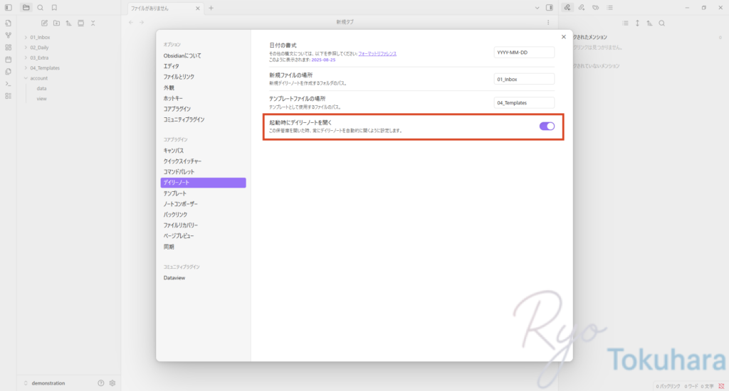 あわせて、「起動時にデイリーノートを開く」設定 をオンにしておく
